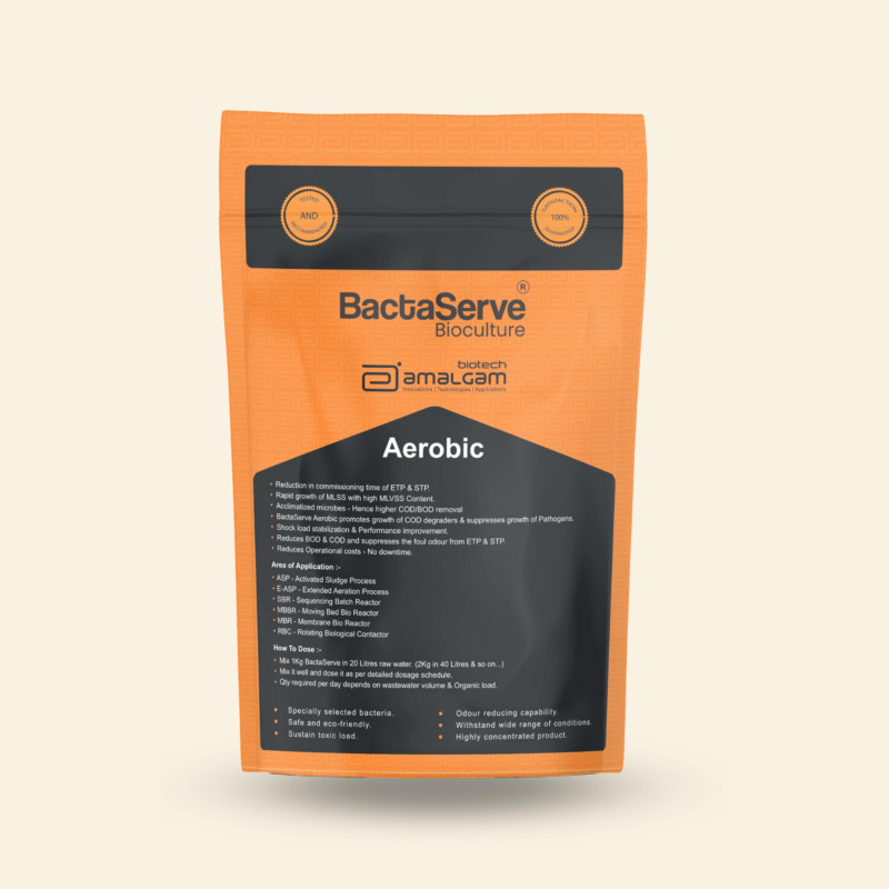 BactaServe (Aerobic) is specially formulated microorganism containing aerobic bacteria which can grown over wide temperature range 5-45°C. BactaServe when added in waste water treatment systems starts multiplying immediately to create higher Biomass content. This helps in biodegradation of BOD content of the waste water.