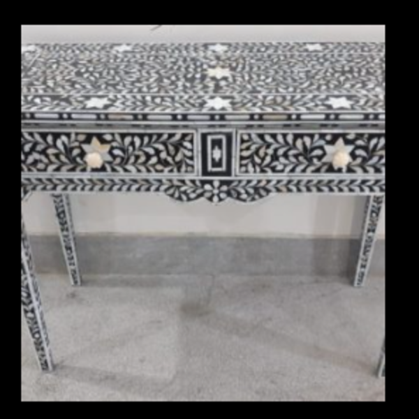 Natural white camel bone and black color resin combination Zebra designer black & white bone inlay Console / Desk. This inlay work  handmade by the artisan of Jot International Crafts. Bone / mother of pearl / wood inlay is a furniture-making process in which bits of wood or bone or shell are pressed into the design.