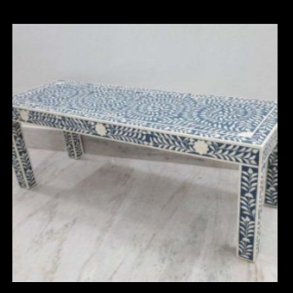 The inlay furniture is made in the magical region of Rajasthan India, using honorably sourced camel bone and mother of pearl shell.Each piece is handcrafted by artisans in a process that can take weeks. Delicate carved pieces of bone / wood and shell are individually inlaid onto a wooden frame in elaborate intricate patterns. Layers of colored resin are then used to fill around the bone / wood and mother of pearl shell.