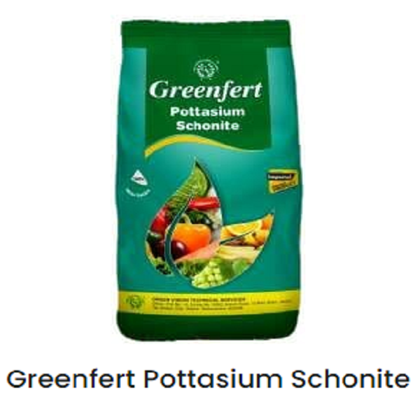Details:        Greenfert Pottasium Schonite is Potassic Fertilizer which is used as straight fertilizer as well as for Fertigation and Foliar application. It is nature’s unique & perfectly balanced rich source of Pottasium, Magnesium and Sulphur in 100% water soluble form. Greenfert Pottasium Schonite is unique fertilizer which contains three important nutrients in balanced proportion, hence it pays vital role in rapid and healthy growth for all the crops, resulting in quality produce and high yeild.