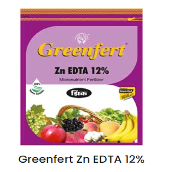 Greenfert Zn EDTA is the product, which is used to recover or to prevent the major micronutrient deficiencies in all field and horticultural crops. This is a free flowering crystalline powder with 12% Zinc. In this product the Zinc is chelated by a chelating agent EDTA (Ethylene diamine tetra acetic acid). The product is recommended for soil application as well as for foliar application.