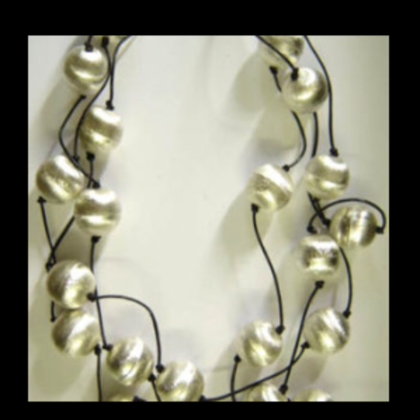 Black color soft cord with Silver, Gold and Copper color cloth ball crafted Necklace with handmade by the artisans of Jot International Crafts.The fine finishing and smooth make them very attractive in look.The fine finishing and smooth make them very attractive in look. Perfect for all of your colorful outfits and This Necklace  with pair any dress / outfit.